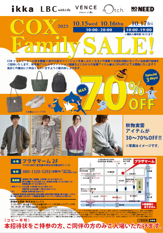 COX ファミリーセール秋を開催がきまりました!! 秋の行楽やファッションを楽しみたくなるこの季節!! 日頃お世話になっている地域の皆様に向けて、初秋、秋物アパレル、雑貨を最大70%OFF にて大開催いたします!!