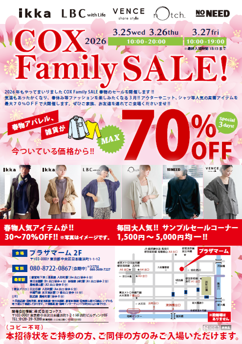 2026 年もやってまいりましたCOX Family SALE 春物セールを開催します!!